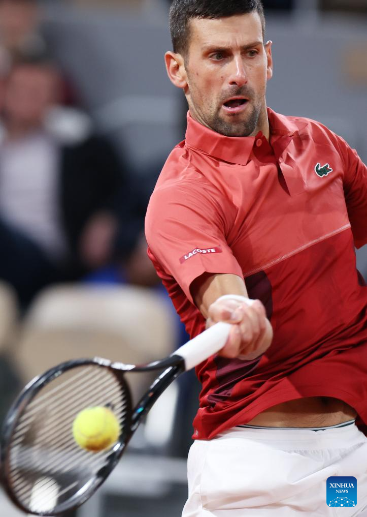 Novak Djokovic of Serbia hits a return during the men's singles second round match between Novak Djokovic of Serbia and Roberto Carballes Baena of Spain at the French tennis tournament at Roland Garros in Paris, France, on May 30, 2024. (Xinhua/Gao Jing)
