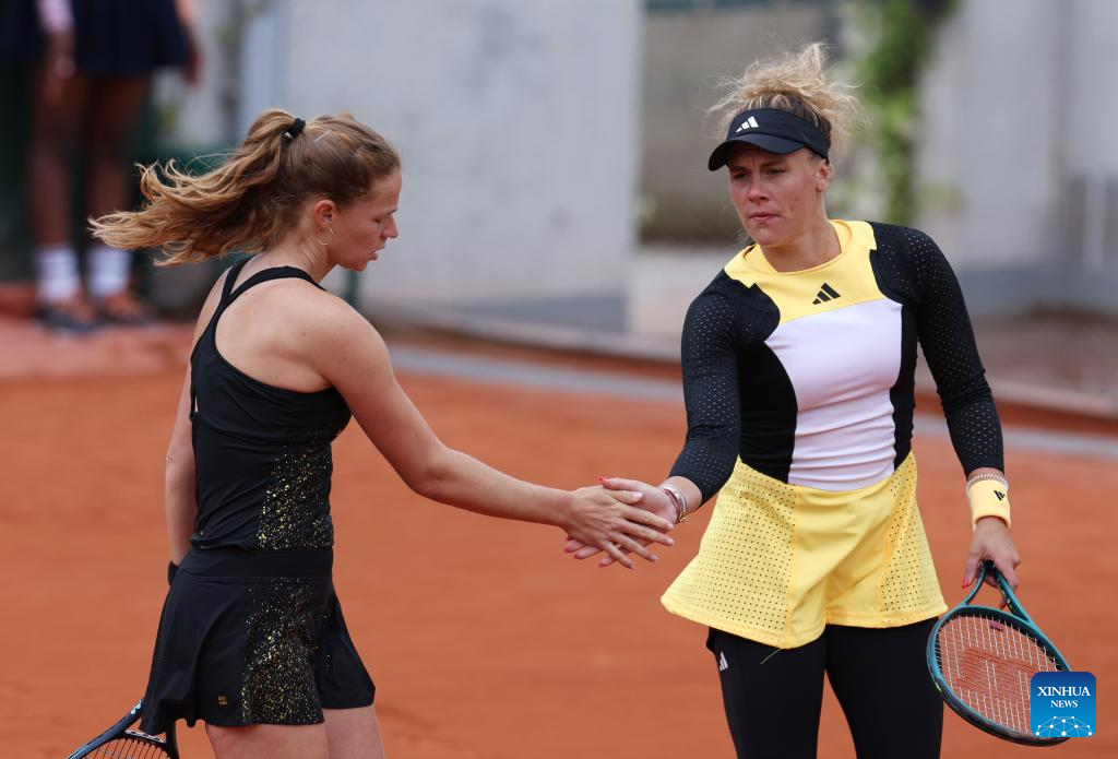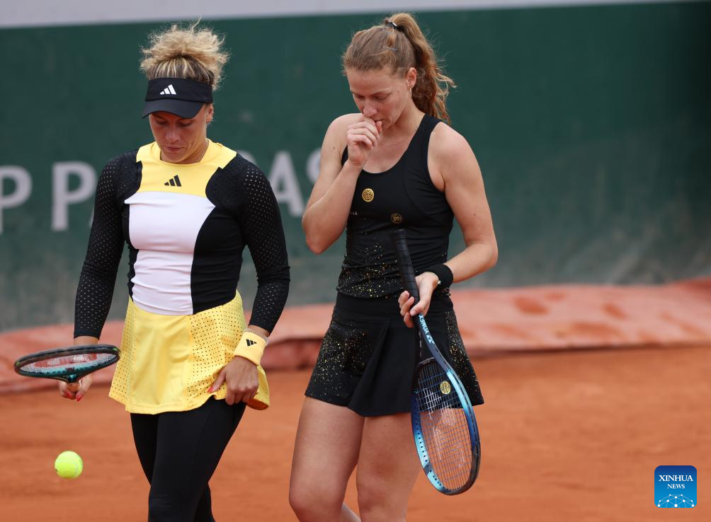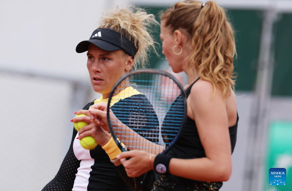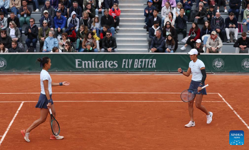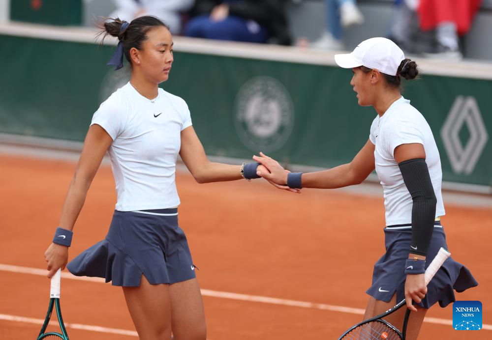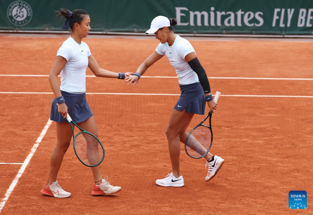 Wang Yafan/Maia Lumsden (R) compete during the women's doubles first round match between Wang Yafan of China/Maia Lumsden of Britain and Zhu Lin of China/Wu Fang-Hsien of Chinese Taipei at the French tennis tournament at Roland Garros in Paris, France, on May 31, 2024. (Xinhua/Gao Jing)