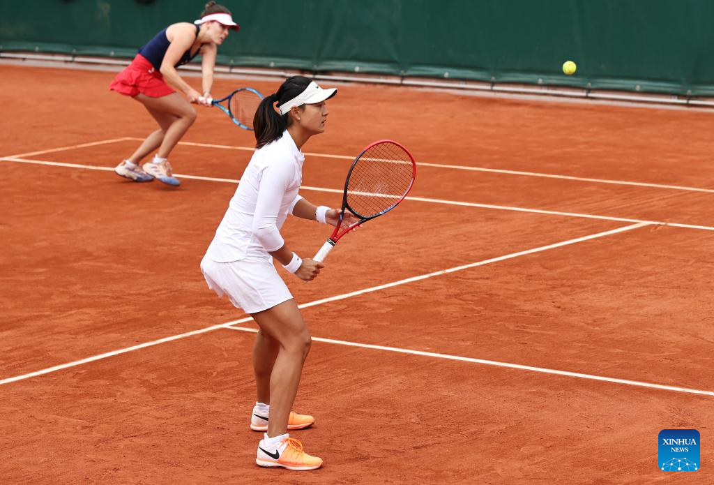 Wang Yafan (R)/Maia Lumsden compete during the women's doubles first round match between Wang Yafan of China/Maia Lumsden of Britain and Zhu Lin of China/Wu Fang-Hsien of Chinese Taipei at the French tennis tournament at Roland Garros in Paris, France, on May 31, 2024. (Xinhua/Gao Jing)