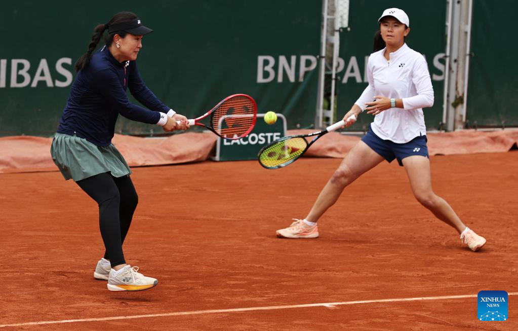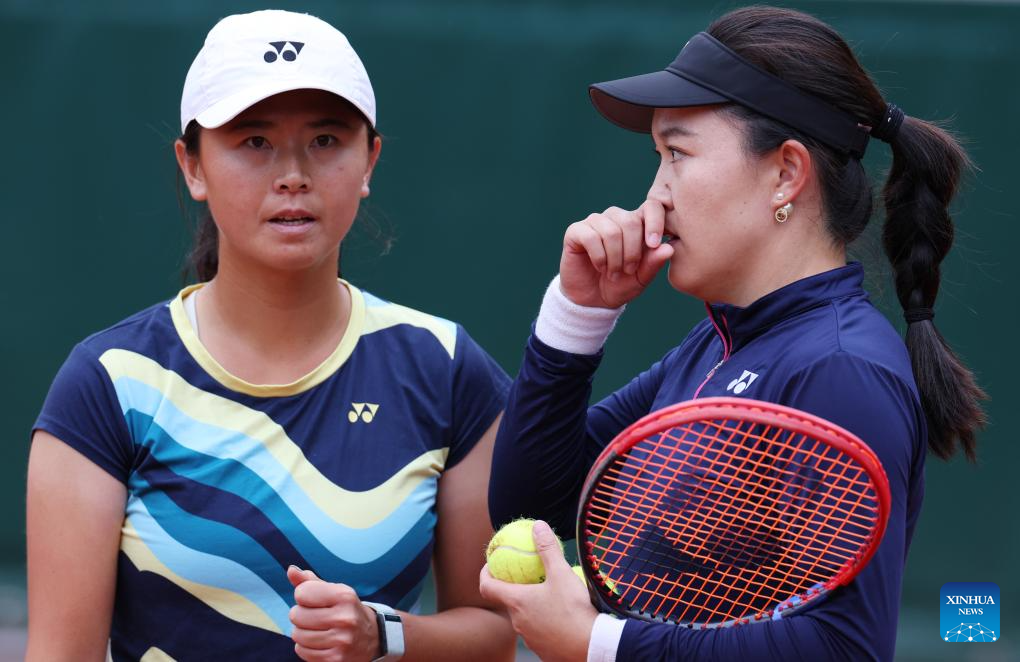Zhu Lin (L)/Wu Fang-Hsien compete during the women's doubles first round match between Wang Yafan of China/Maia Lumsden of Britain and Zhu Lin of China/Wu Fang-Hsien of Chinese Taipei at the French tennis tournament at Roland Garros in Paris, France, on May 31, 2024. (Xinhua/Gao Jing)