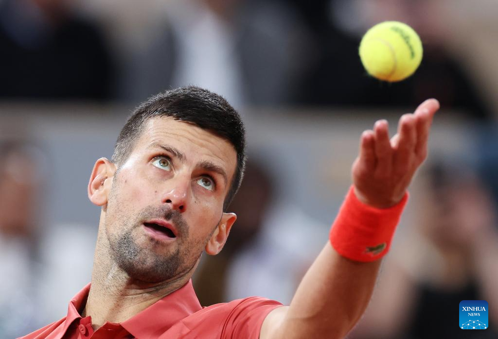 Novak Djokovic of Serbia serves the ball during the men's singles second round match between Novak Djokovic of Serbia and Roberto Carballes Baena of Spain at the French tennis tournament at Roland Garros in Paris, France, on May 30, 2024. (Xinhua/Gao Jing)