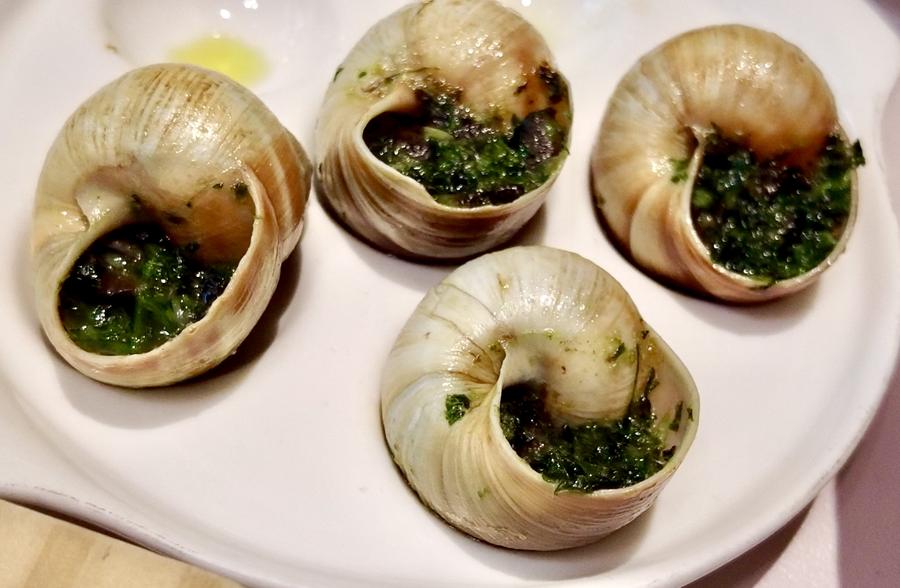 Escargots, or snails, were served in garlic butter with parsley on a platter with rounded indents for each shell. As I steadied a snail with tongs specifically designed to match the shape of the shell in one hand and carefully extracted the inner meat with a fork in the other, the ritual made this dining experience a novel delight.