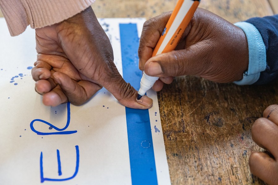 A person gets an ink mark before casting the ballot at a polling station in Soweto in Johannesburg, South Africa, on May 29, 2024. (Xinhua/Zhang Yudong)