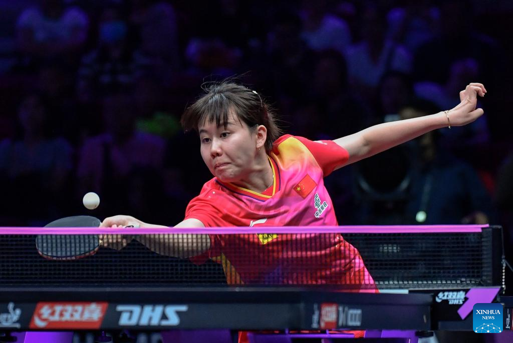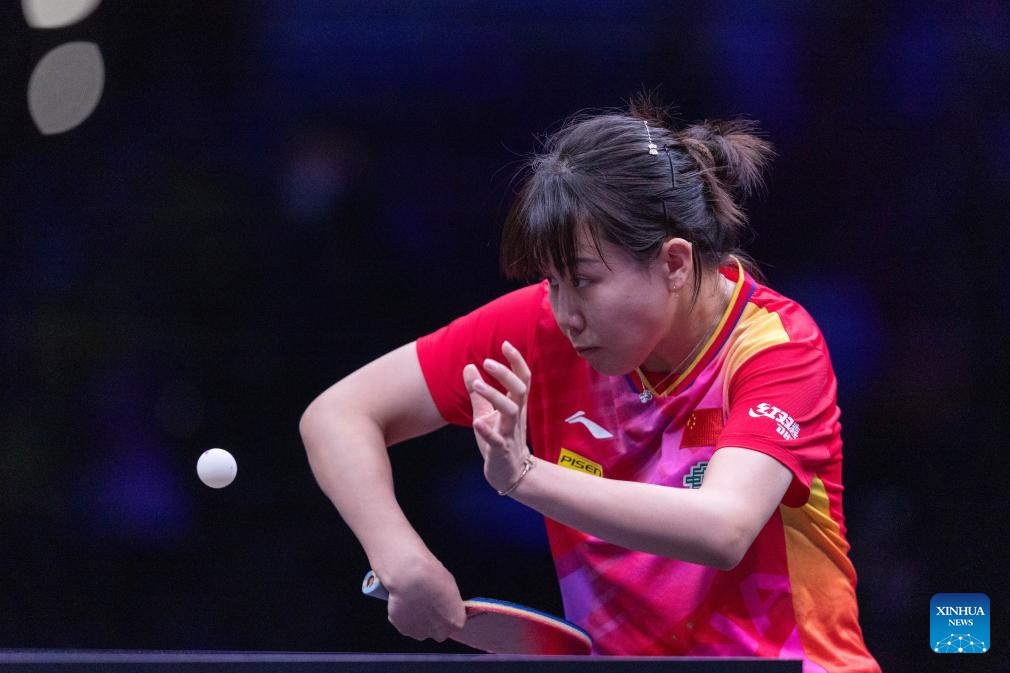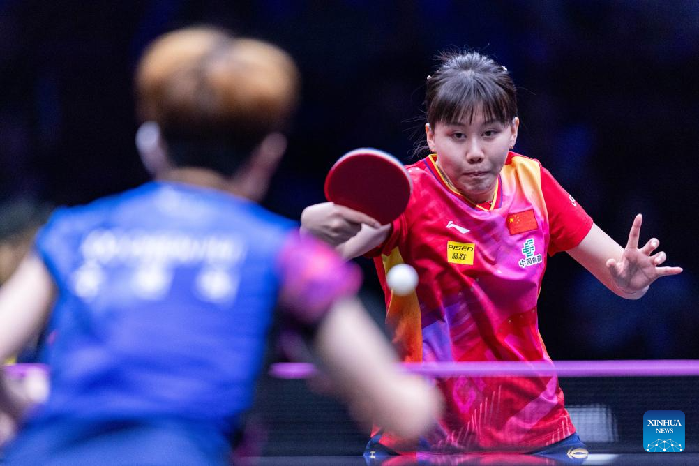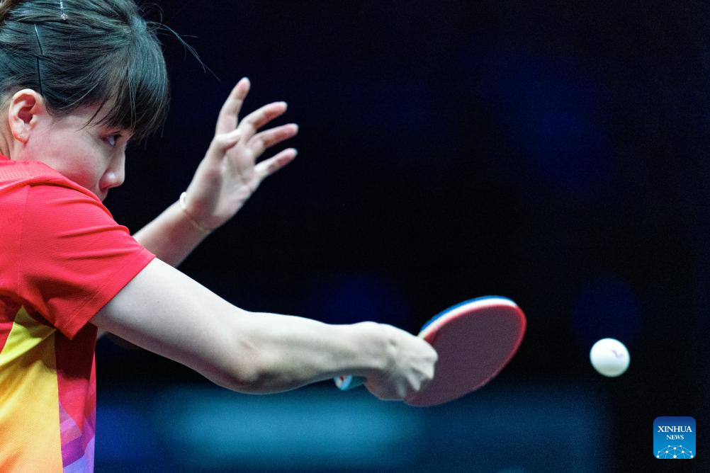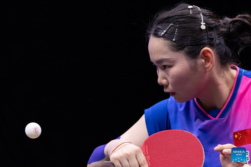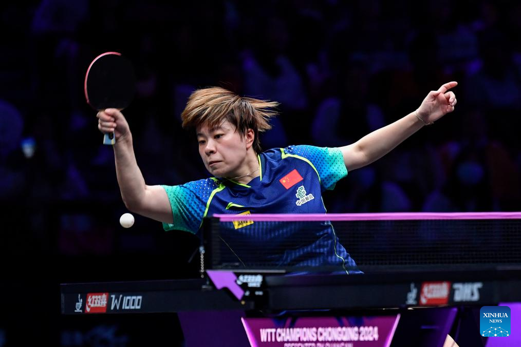 Wang Yidi of China hits a return to He Zhuojia of China during the women's singles round of 16 match at the WTT Champions Chongqing 2024 in southwest China's Chongqing, June 1, 2024. (Xinhua/Huang Wei)