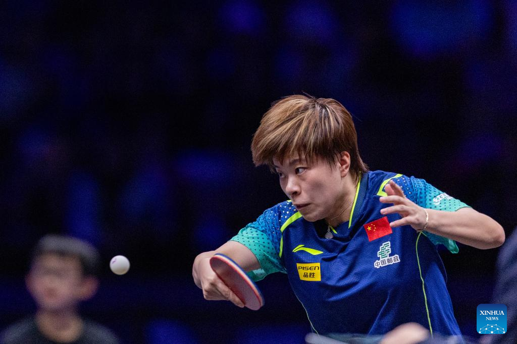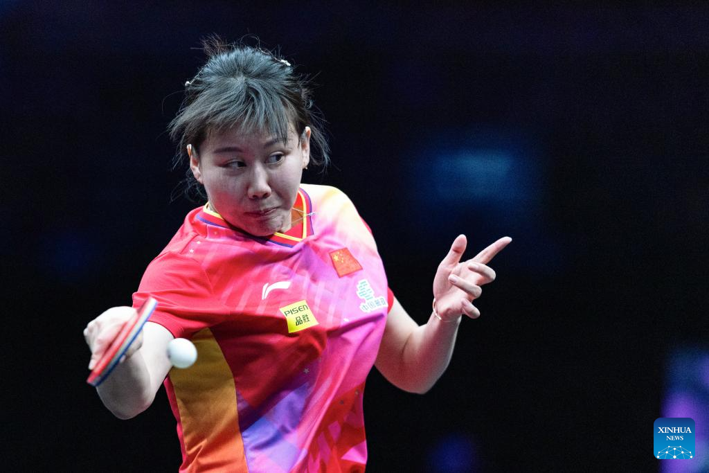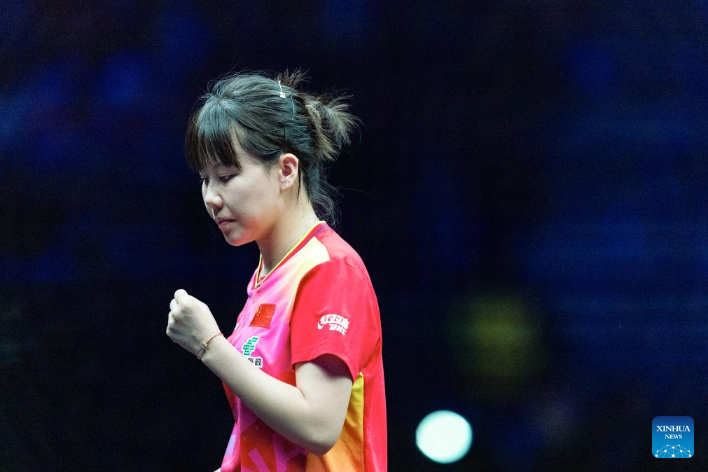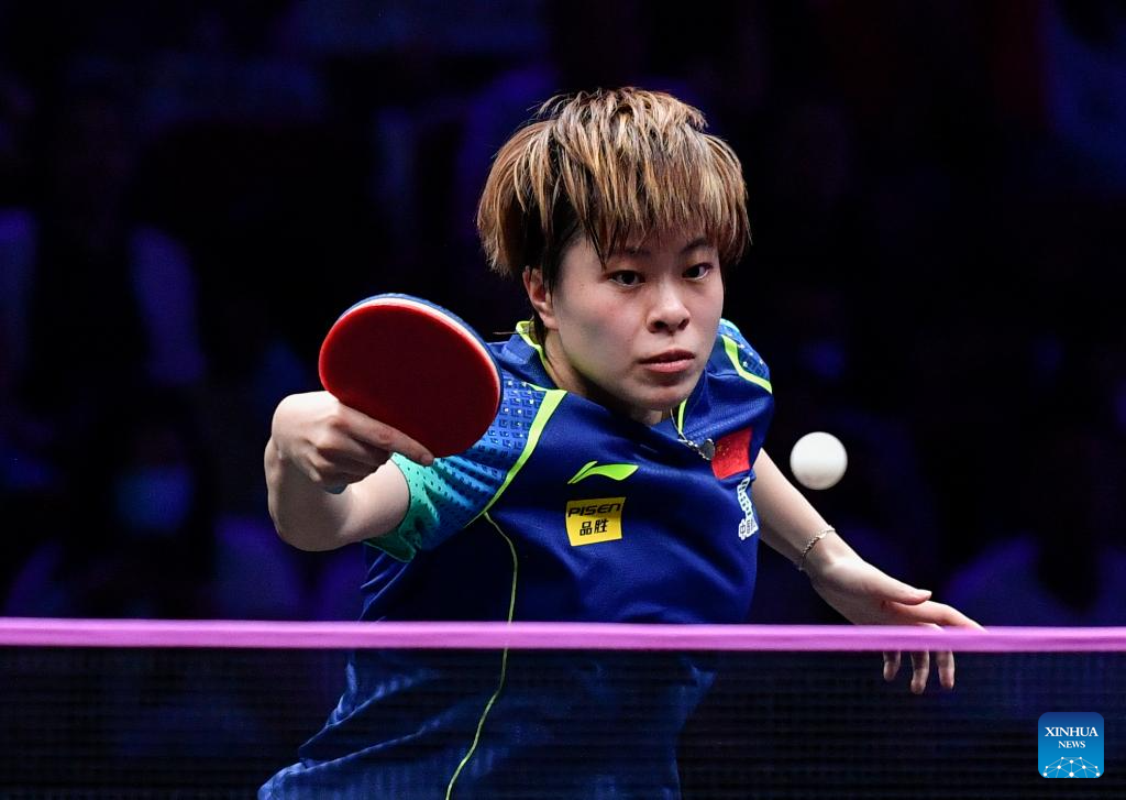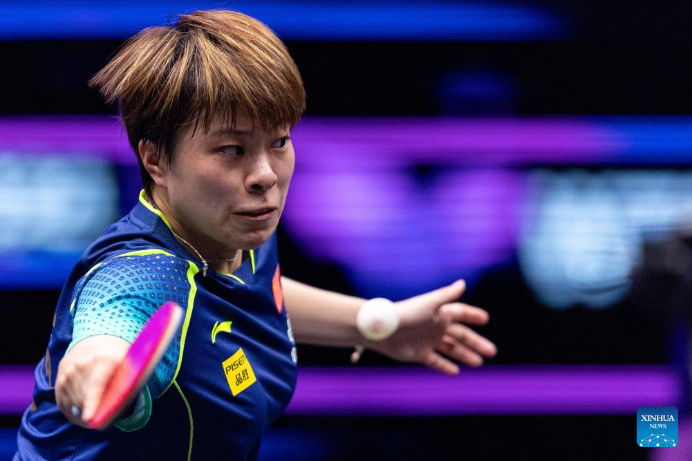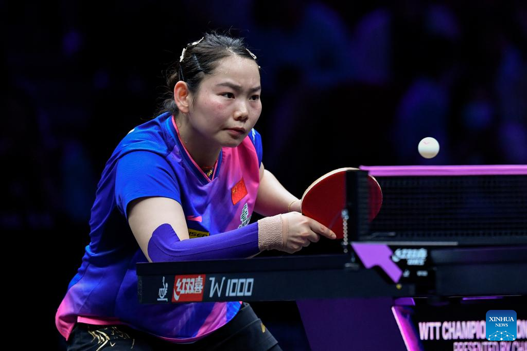 Wang Yidi of China hits a return to He Zhuojia of China during the women's singles round of 16 match at the WTT Champions Chongqing 2024 in southwest China's Chongqing, June 1, 2024. (Xinhua/Huang Wei)