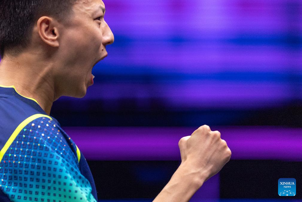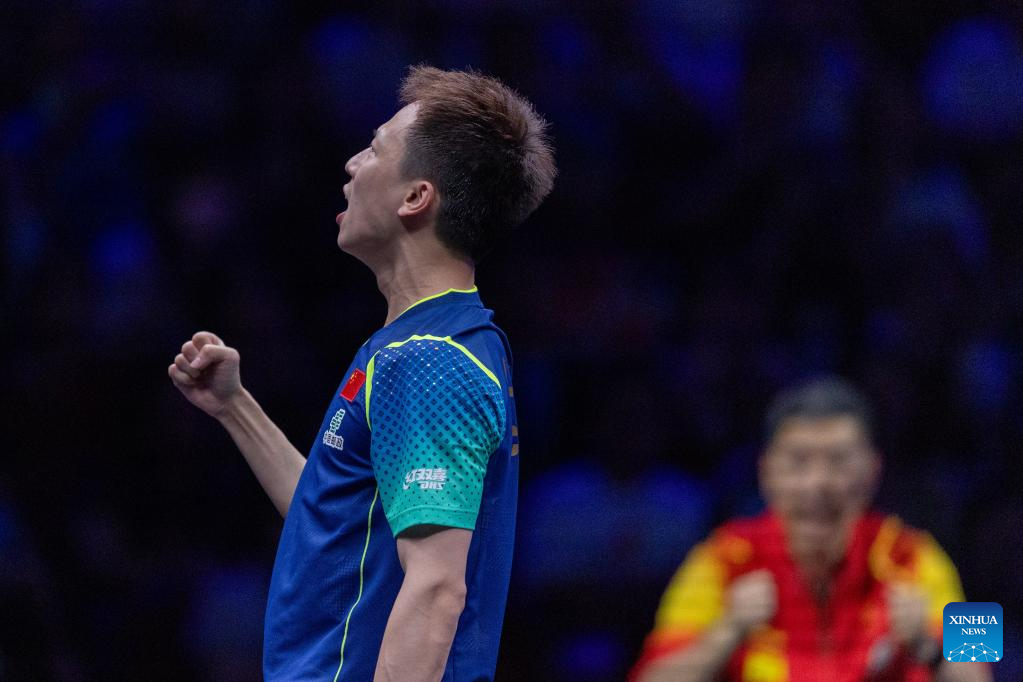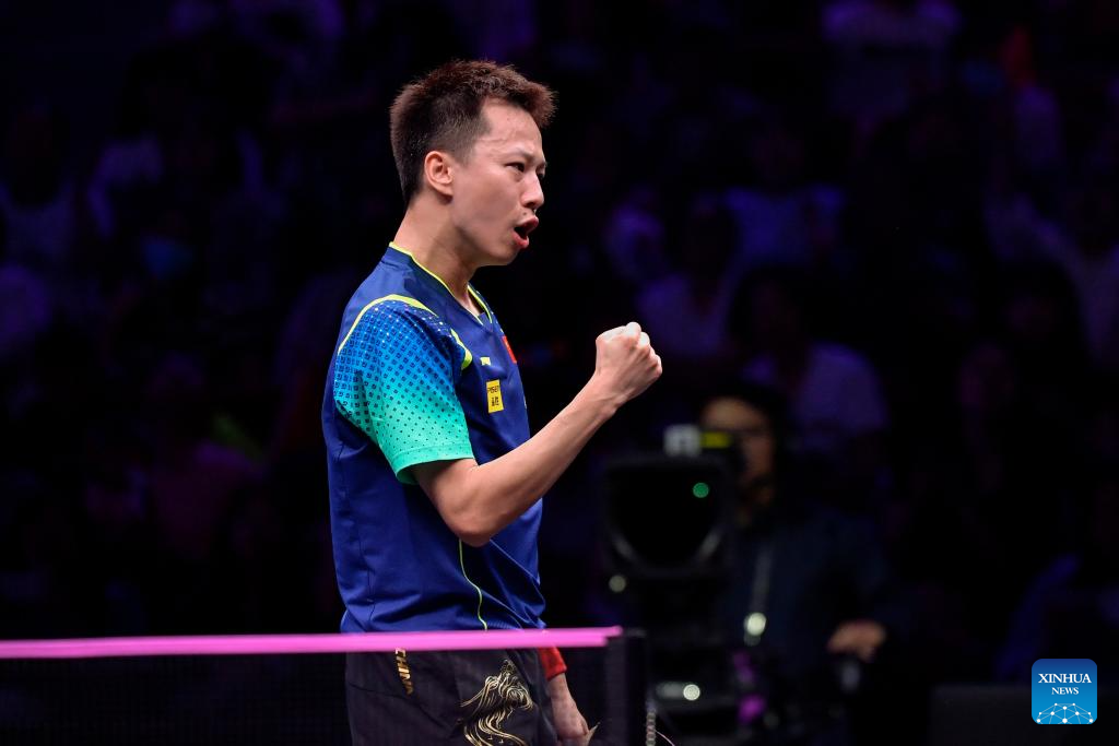 Lin Gaoyuan of China celebrates while competing against Kao Cheng-Jui of Chinese Taipei during the men's singles round of 16 match at the WTT Champions Chongqing 2024 in southwest China's Chongqing, June 1, 2024. (Xinhua/Huang Wei)