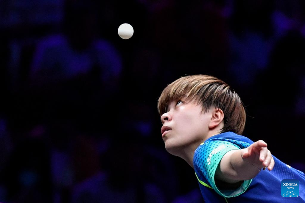 Wang Yidi of China serves to He Zhuojia of China during the women's singles round of 16 match at the WTT Champions Chongqing 2024 in southwest China's Chongqing, June 1, 2024. (Xinhua/Zhang Ziyu)