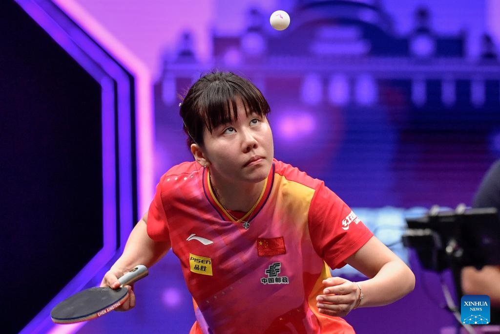 Chen Xingtong of China hits a return to Joo Cheonhui of South Korea during the women's singles round of 16 match at the WTT Champions Chongqing 2024 in southwest China's Chongqing, June 1, 2024. (Xinhua/Zhang Ziyu)