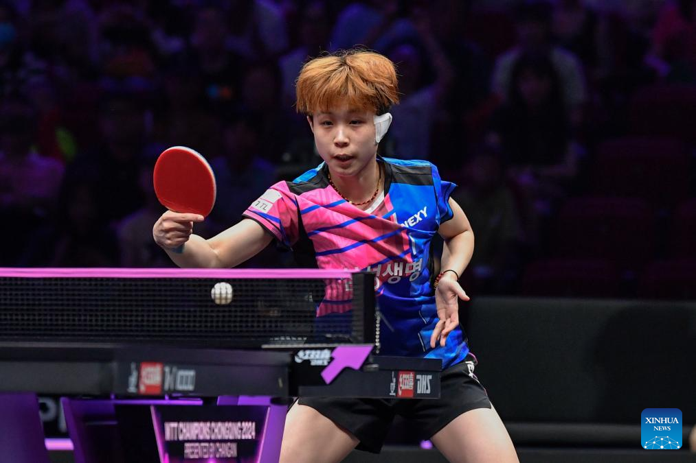 Joo Cheonhui of South Korea hits a return to Chen Xingtong of China during the women's singles round of 16 match at the WTT Champions Chongqing 2024 in southwest China's Chongqing, June 1, 2024. (Xinhua/Zhang Ziyu)