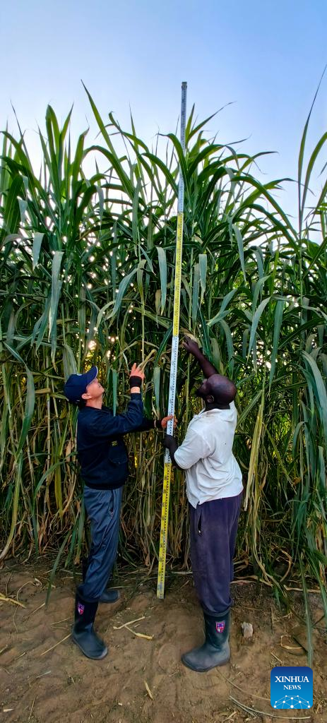 Zhang Hong'en, director of the animal husbandry technology demonstration center in Mauritania, checks the growth of Juncao from China with a local staff in Mauritania, Feb. 19, 2024. (Xinhua)