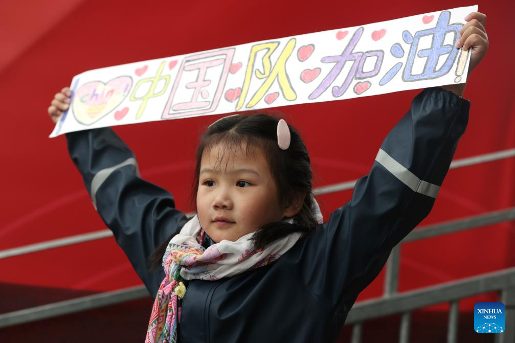 A girl cheers for team China during the FIH Hockey Pro League women's match between China and Belgium in Antwerp, Belgium, June 1, 2024. (Xinhua/Zhao Dingzhe)