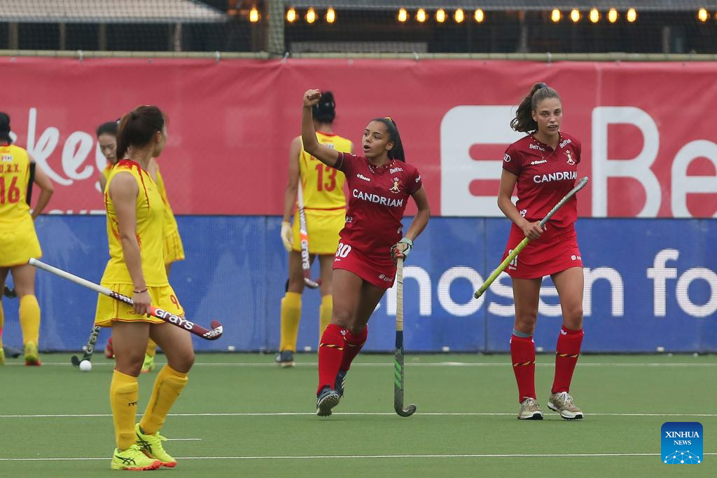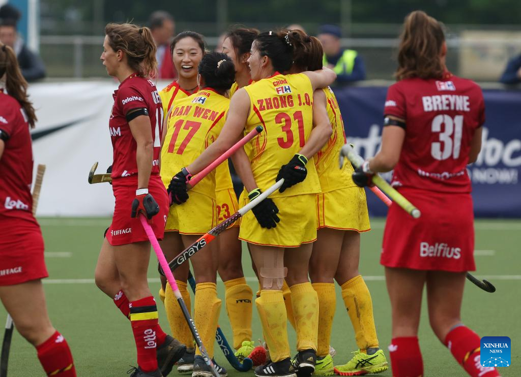 Players of China celebrate during the FIH Hockey Pro League women's match between China and Belgium in Antwerp, Belgium, June 1, 2024. (Xinhua/Zhao Dingzhe)