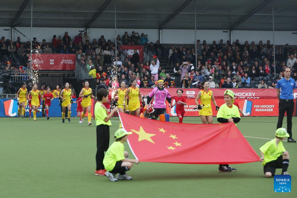 Players of China run into the pitch before the FIH Hockey Pro League women's match between China and Belgium in Antwerp, Belgium, June 1, 2024. (Xinhua/Zhao Dingzhe)