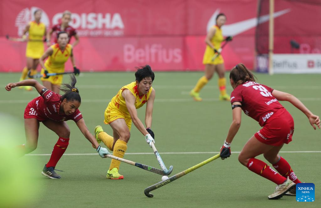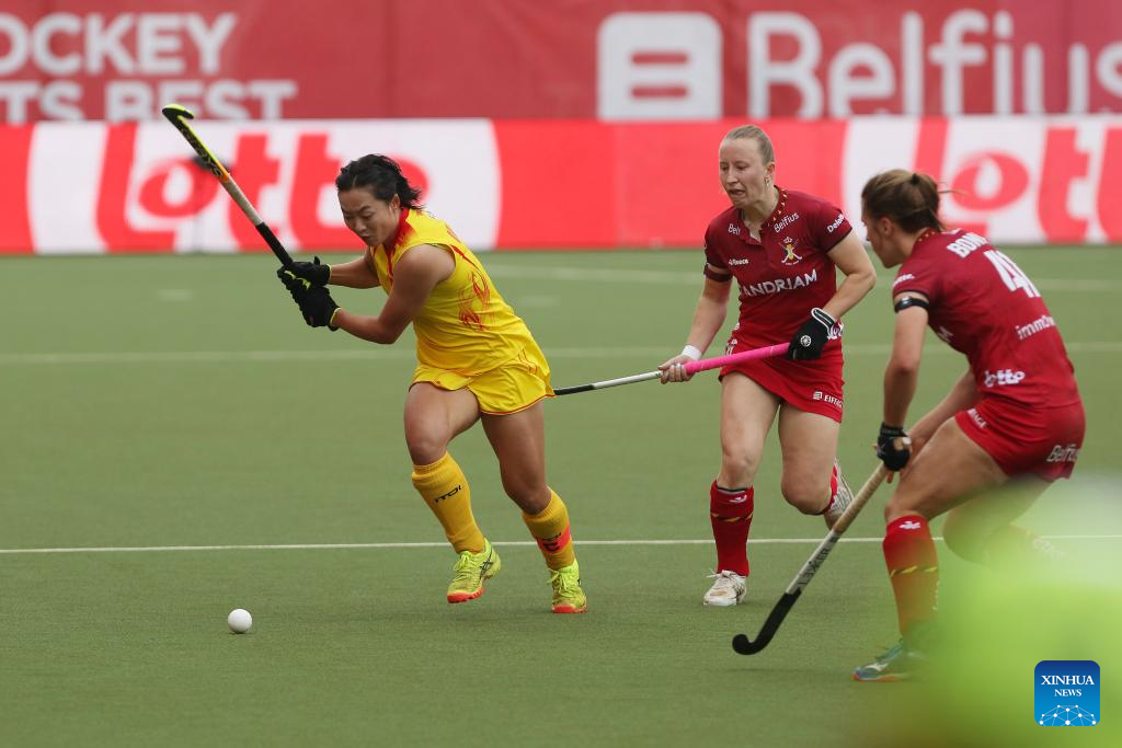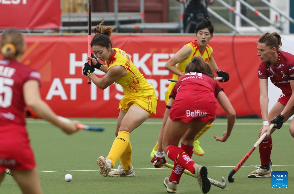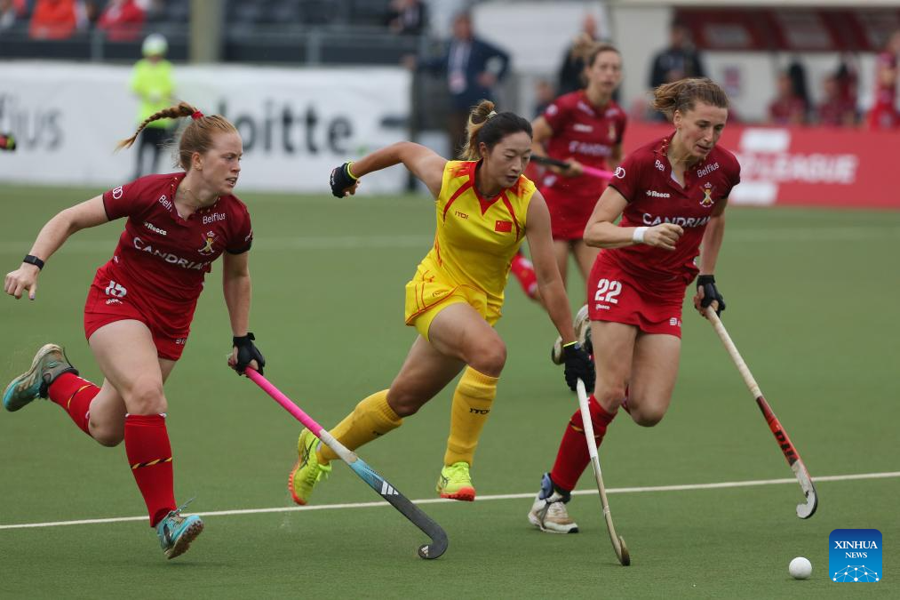 Zhang Xiaoxue (C) of China breaks through during the FIH Hockey Pro League women's match between China and Belgium in Antwerp, Belgium, June 1, 2024. (Xinhua/Zhao Dingzhe)