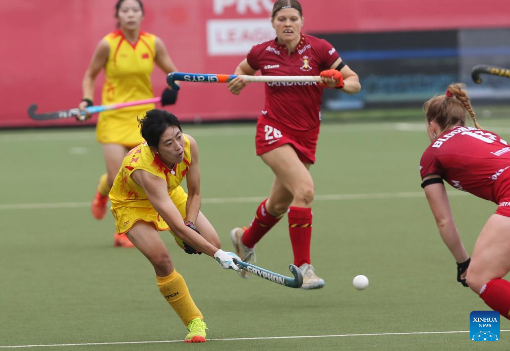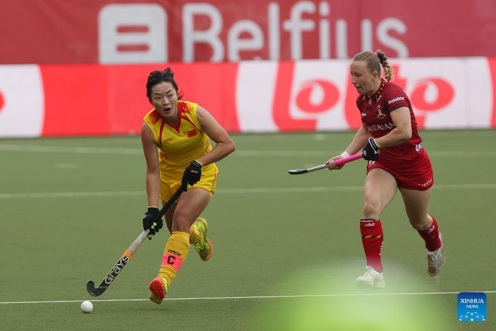 Zhang Xiaoxue (L) of China passes the ball during the FIH Hockey Pro League women's match between China and Belgium in Antwerp, Belgium, June 1, 2024. (Xinhua/Zhao Dingzhe)