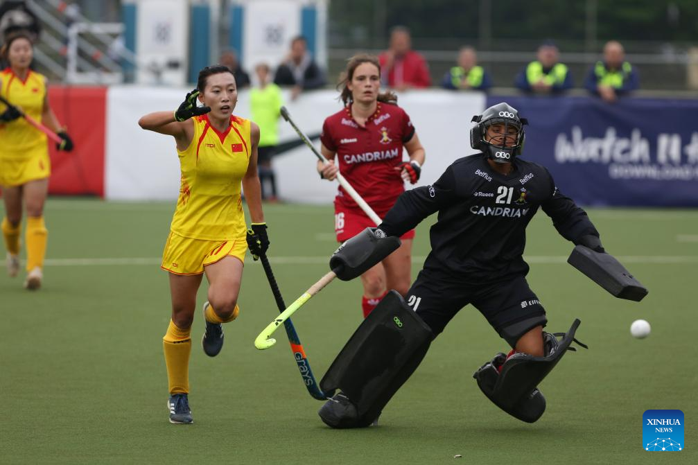 Zhang Ying (2nd L) of China shoots during the FIH Hockey Pro League women's match between China and Belgium in Antwerp, Belgium, June 1, 2024. (Xinhua/Zhao Dingzhe)