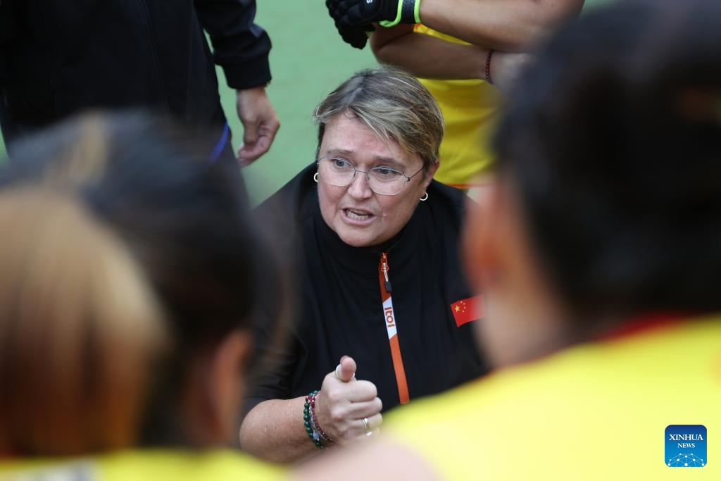 Alyson Annan, head coach of China speaks to the players before the FIH Hockey Pro League women's match between China and Belgium in Antwerp, Belgium, June 1, 2024. (Xinhua/Zhao Dingzhe)