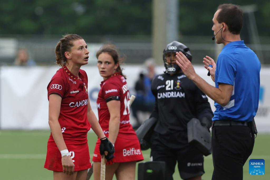 Vanden Borre Stephanie (1st L) of Belgium argues with the referee during the FIH Hockey Pro League women's match between China and Belgium in Antwerp, Belgium, June 1, 2024. (Xinhua/Zhao Dingzhe)