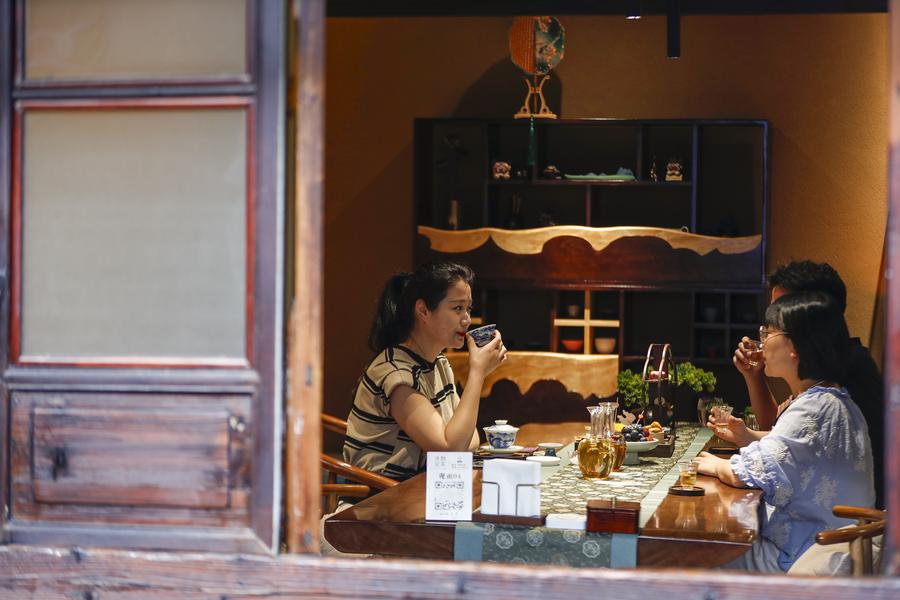 Wang Sun makes a tea beverage at Demingshe, a tea art vocational training school in Huangshan City, east China's Anhui Province, May 23, 2024. (Xinhua/Du Yu)A tea beverage is pictured at Demingshe, a tea art vocational training school in Huangshan City, east China's Anhui Province, May 23, 2024. (Xinhua/Du Yu)Wang Sun makes a tea beverage at Demingshe, a tea art vocational training school in Huangshan City, east China's Anhui Province, May 23, 2024. (Xinhua/Du Yu)Customers drink tea beverages at Demingshe, a tea art vocational training school in Huangshan City, east China's Anhui Province, May 23, 2024. (Xinhua/Du Yu)Customers drink tea beverages at a shop in Huangshan City, east China's Anhui Province, May 23, 2024. (Photo by Shi Yalei/Xinhua)