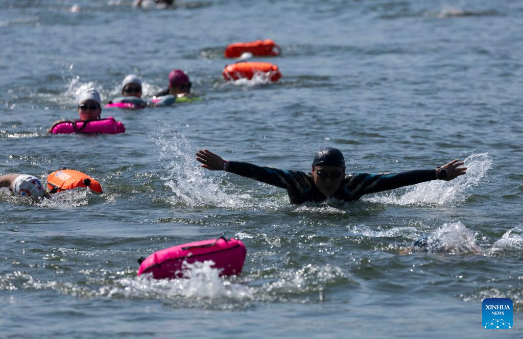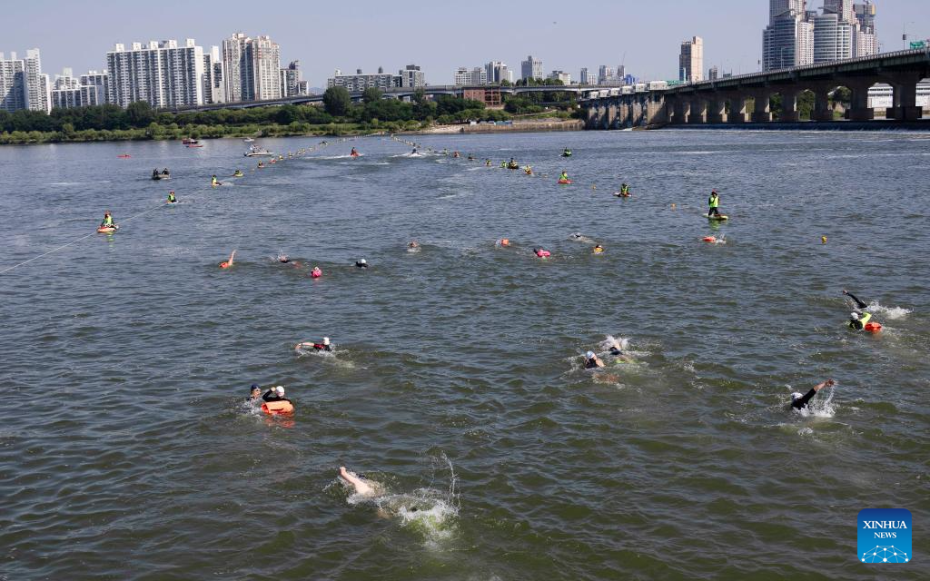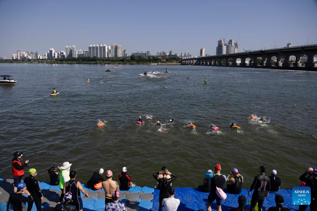 Participants swim across the Hangang River during the 1st Sium Sium Hangang Triathlon Festival in Seoul, South Korea, June 2, 2024. (Photo by Jun Hyosang/Xinhua)