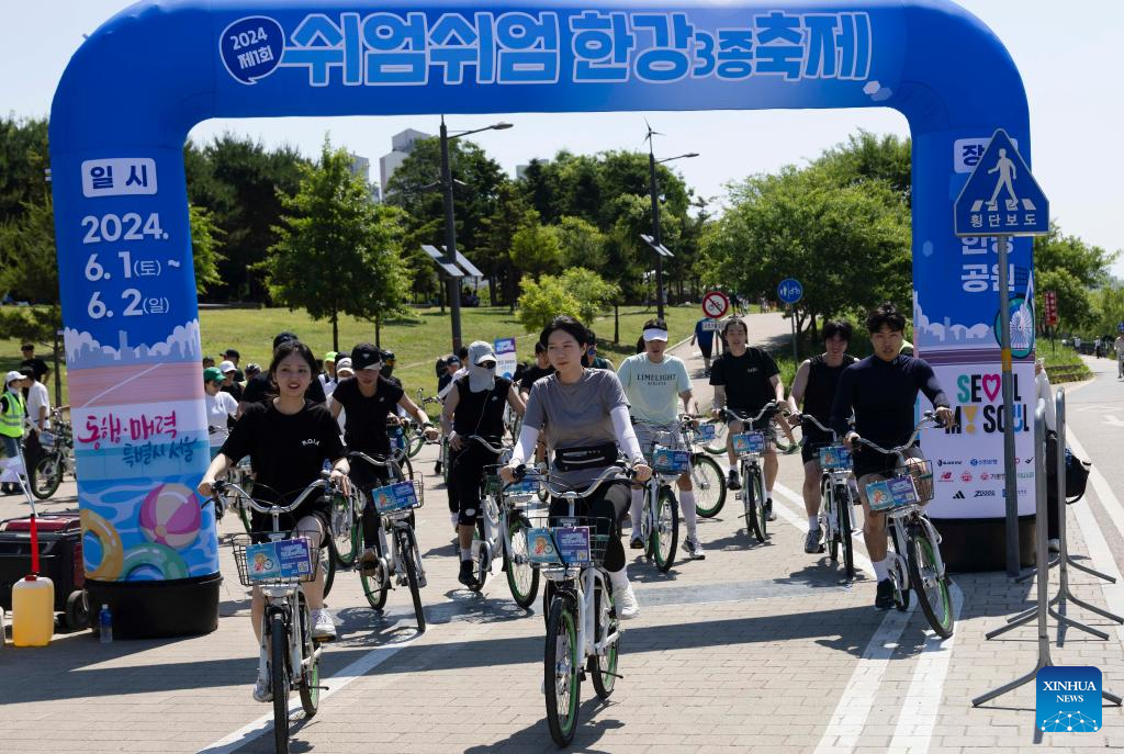 Participants ride during the 1st Sium Sium Hangang Triathlon Festival in Seoul, South Korea, June 2, 2024. (Photo by Jun Hyosang/Xinhua)