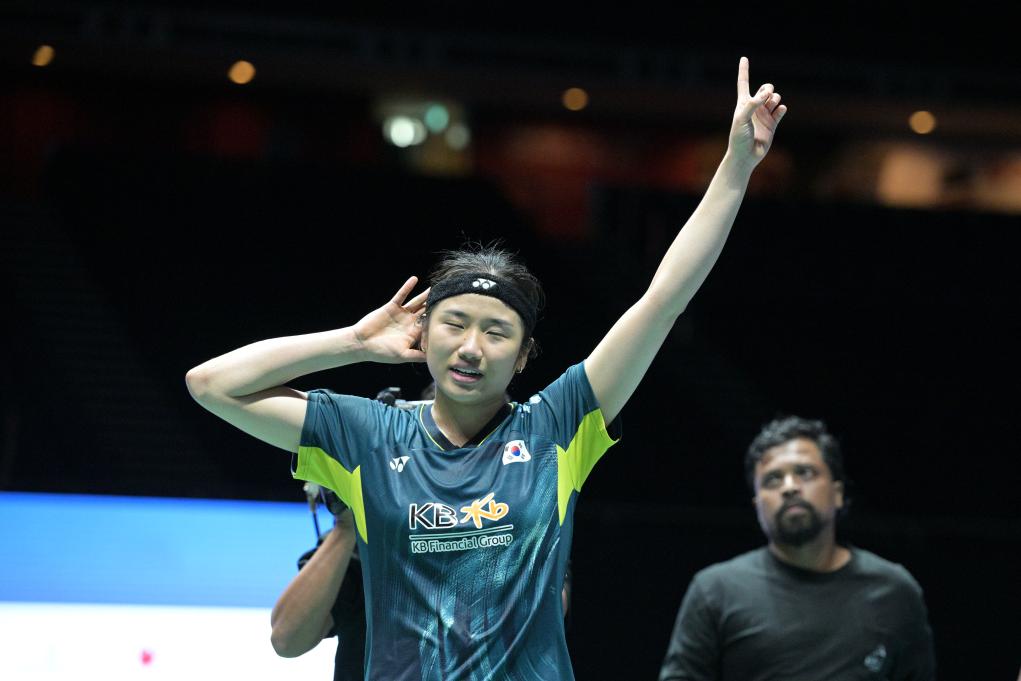 An Se Young celebrates scoring during the women's singles final between An Se Young of South Korea and Chen Yufei of China at the Singapore Badminton Open 2024 in Singapore, June 2, 2024. (Photo by Then Chih Wey/Xinhua)