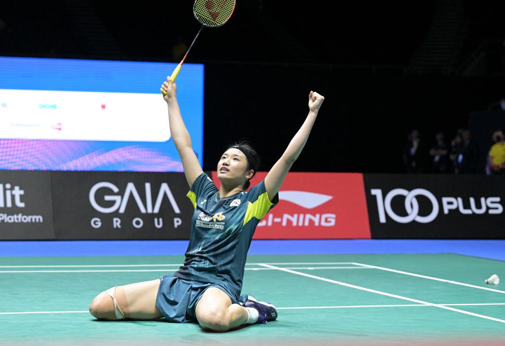 An Se Young celebrates after winning the women's singles final between An Se Young of South Korea and Chen Yufei of China at the Singapore Badminton Open 2024 in Singapore, June 2, 2024. (Photo by Then Chih Wey/Xinhua)