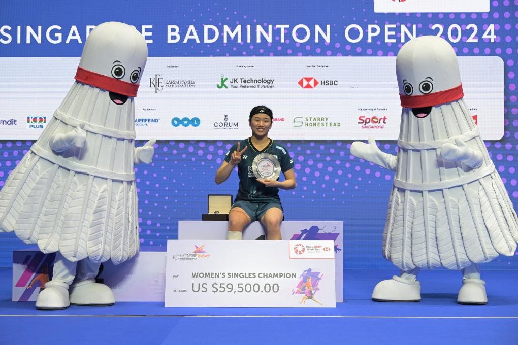 Champion An Se Young poses on the podium after the women's singles final between An Se Young of South Korea and Chen Yufei of China at the Singapore Badminton Open 2024 in Singapore, June 2, 2024. (Photo by Then Chih Wey/Xinhua)