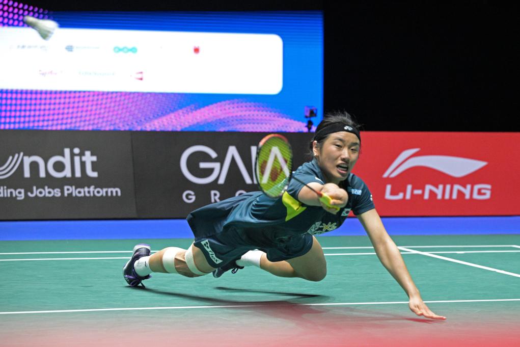 An Se Young hits a return during the women's singles final between An Se Young of South Korea and Chen Yufei of China at the Singapore Badminton Open 2024 in Singapore, June 2, 2024. (Photo by Then Chih Wey/Xinhua)