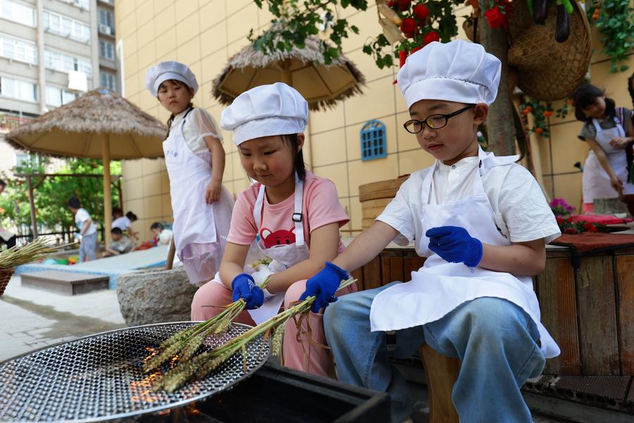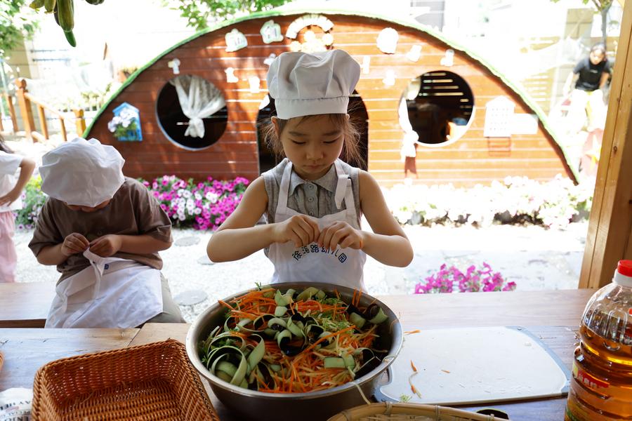 NANJING, June 2 (Xinhua) -- In the city of Xuzhou, located amid the verdant landscapes of east China's Jiangsu Province, Xuhai Road Kindergarten produces an unconventional symphony featuring the rhythmic chopping of vegetables, the comforting sizzle of baking buns, and the gentle grind of the soybean milk milling process.
