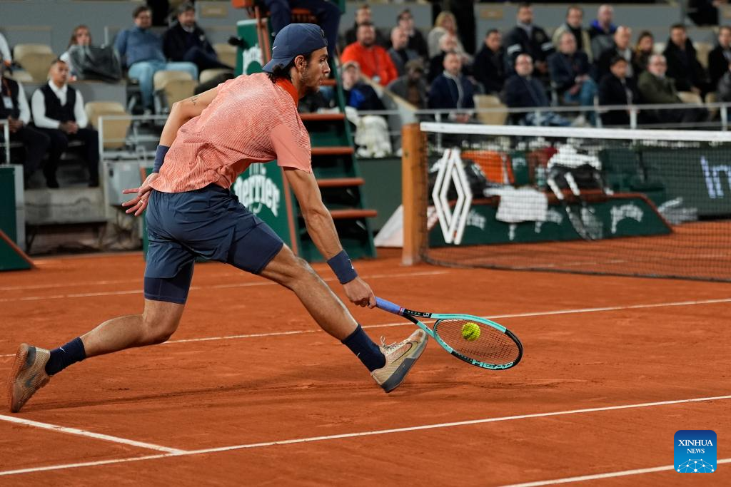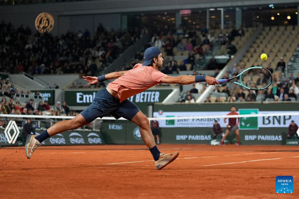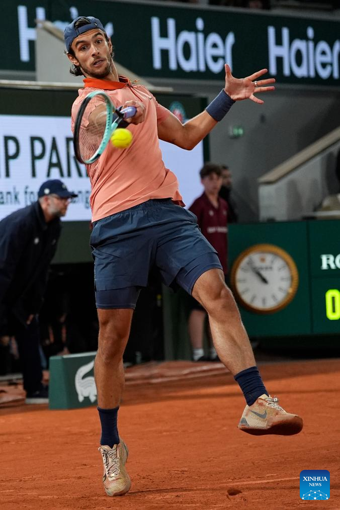 Lorenzo Musetti hits a return during the men's singles third round match between Novak Djokovic of Serbia and Lorenzo Musetti of Italy at the French tennis tournament at Roland Garros in Paris, France, June 1, 2024. (Photo by Glenn Gervot/Xinhua)