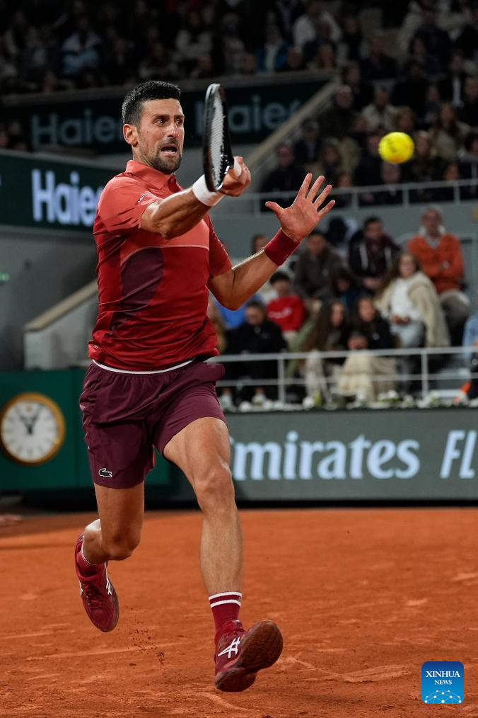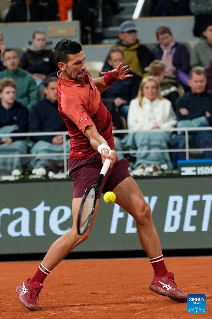 Novak Djokovic hits a return during the men's singles third round match between Novak Djokovic of Serbia and Lorenzo Musetti of Italy at the French tennis tournament at Roland Garros in Paris, France, June 1, 2024. (Photo by Glenn Gervot/Xinhua)