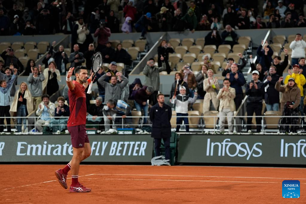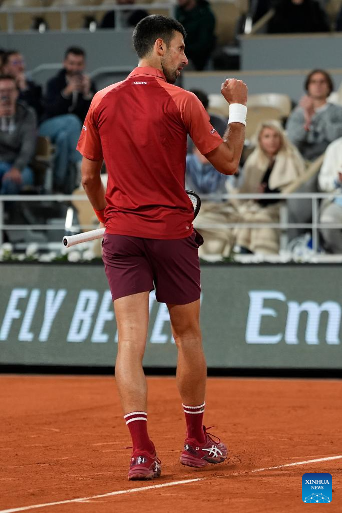Novak Djokovic celebrates victory after winning the men's singles third round match between Novak Djokovic of Serbia and Lorenzo Musetti of Italy at the French tennis tournament at Roland Garros in Paris, France, June 2, 2024. (Photo by Glenn Gervot/Xinhua)