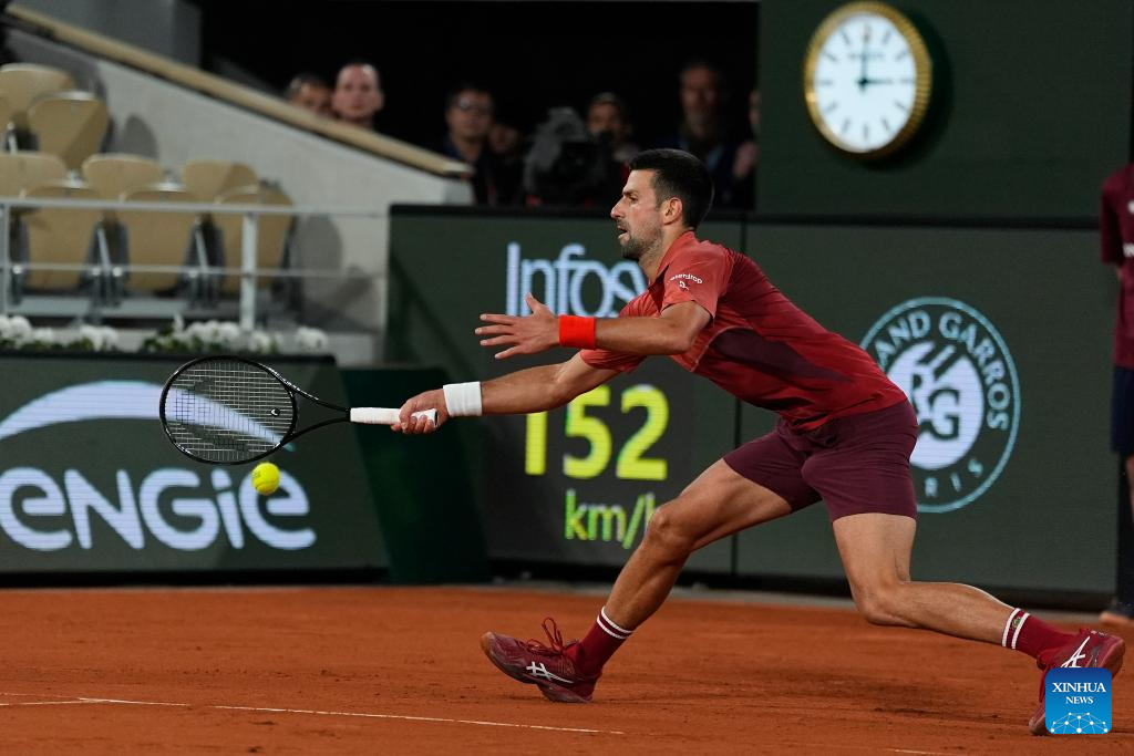 Novak Djokovic hits a return during the men's singles third round match between Novak Djokovic of Serbia and Lorenzo Musetti of Italy at the French tennis tournament at Roland Garros in Paris, France, June 2, 2024. (Photo by Glenn Gervot/Xinhua)