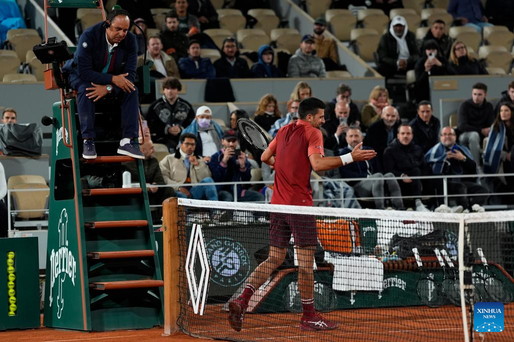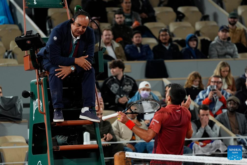 Novak Djokovic (R) communicates with the referee during the men's singles third round match between Novak Djokovic of Serbia and Lorenzo Musetti of Italy at the French tennis tournament at Roland Garros in Paris, France, June 2, 2024. (Photo by Glenn Gervot/Xinhua)