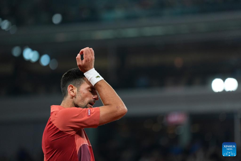 Novak Djokovic reacts during the men's singles third round match between Novak Djokovic of Serbia and Lorenzo Musetti of Italy at the French tennis tournament at Roland Garros in Paris, France, June 1, 2024. (Photo by Glenn Gervot/Xinhua)