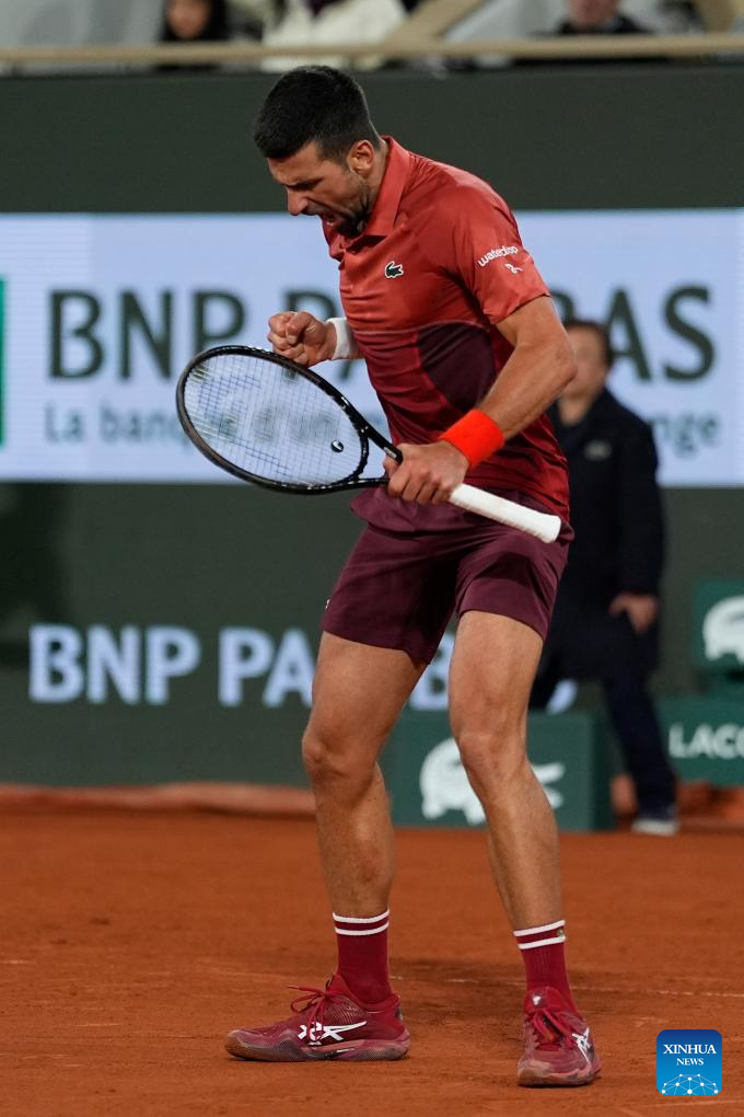 Novak Djokovic celebrates scoring during the men's singles third round match between Novak Djokovic of Serbia and Lorenzo Musetti of Italy at the French tennis tournament at Roland Garros in Paris, France, June 2, 2024. (Photo by Glenn Gervot/Xinhua)