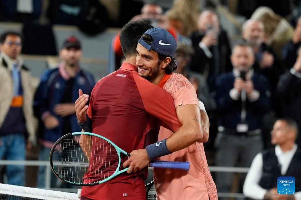 Novak Djokovic (L) greets Lorenzo Musetti after the men's singles third round match between Novak Djokovic of Serbia and Lorenzo Musetti of Italy at the French tennis tournament at Roland Garros in Paris, France, June 2, 2024. (Photo by Glenn Gervot/Xinhua)