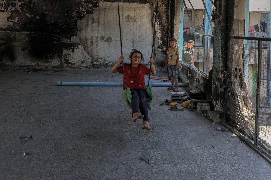 Palestinian children are seen among destroyed buildings in the southern Gaza Strip city of Khan Younis, May 31, 2024. (Photo by Rizek Abdeljawad/Xinhua)A Palestinian child is pictured at a temporary refugee camp in the southern Gaza Strip city of Khan Younis, May 31, 2024. (Photo by Rizek Abdeljawad/Xinhua)Palestinian children sit over the rubble of their destroyed house in the southern Gaza Strip city of Khan Younis, May 31, 2024. (Photo by Rizek Abdeljawad/Xinhua)Palestinian children play at a temporary refugee camp in the southern Gaza Strip city of Khan Younis, May 31, 2024. (Photo by Rizek Abdeljawad/Xinhua)■