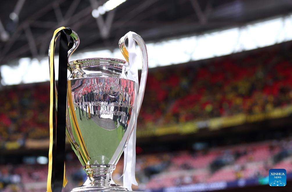 The trophy is seen before the UEFA Champions League final match between Real Madrid and Borussia Dortmund in London, Britain, June 1, 2024. (Xinhua/Str)