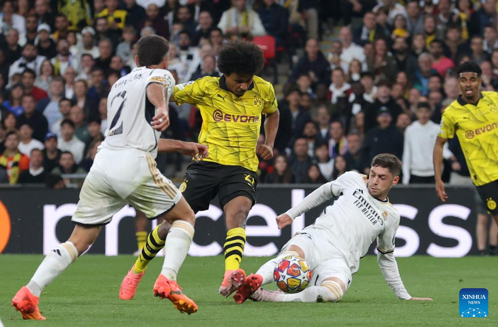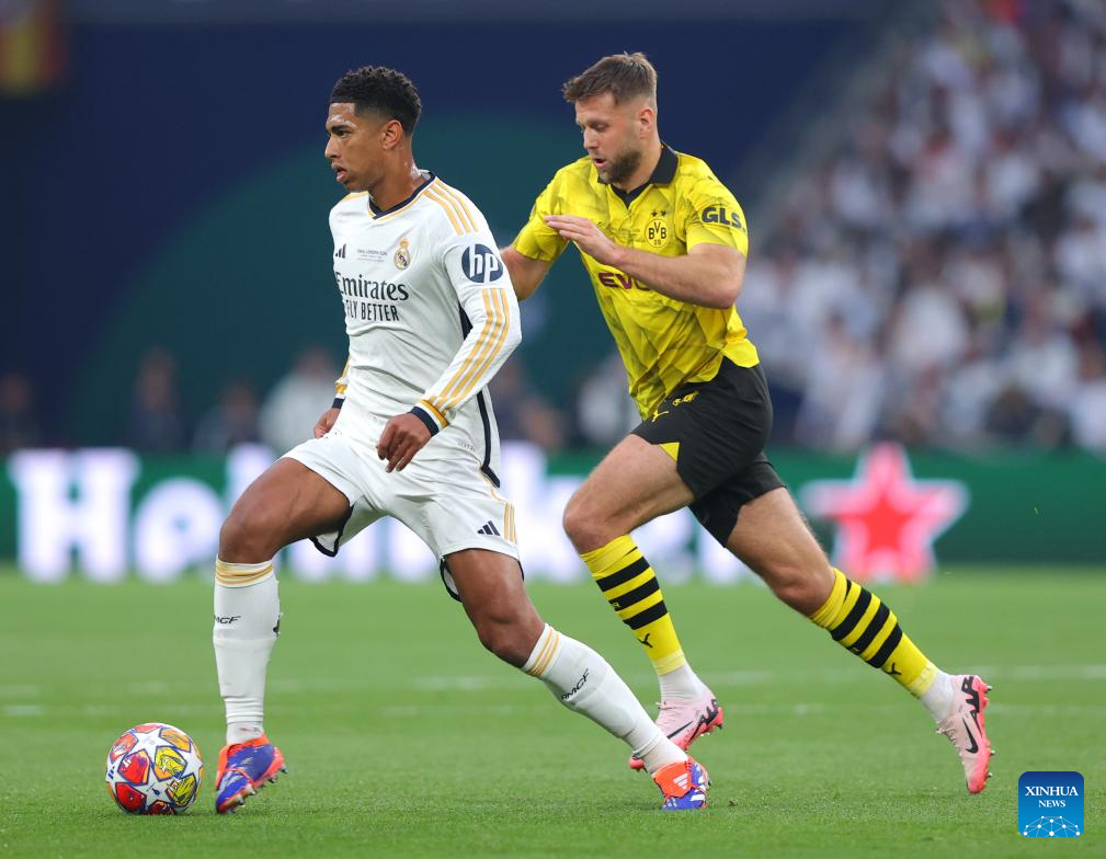 Jude Bellingham (L) of Real Madrid controls the ball during the UEFA Champions League final match between Real Madrid and Borussia Dortmund in London, Britain, June 1, 2024. (Xinhua/Str)