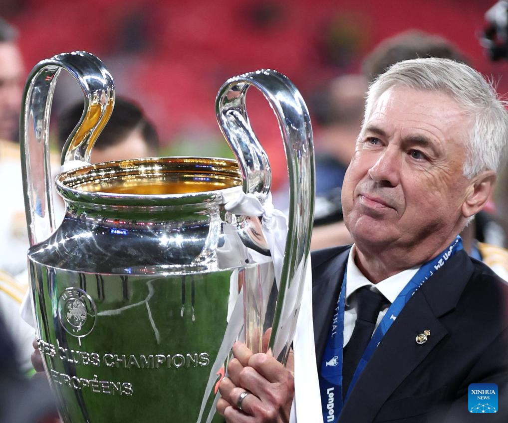 Real Madrid's head coach Carlo Ancelotti celebrates with the trophy after winning the UEFA Champions League final match between Real Madrid and Borussia Dortmund in London, Britain, June 1, 2024. (Xinhua/Str)