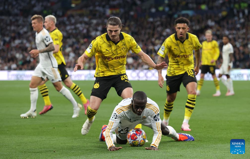 Ferland Mendy of Real Madrid (bottom) vies with Marcel Sabitzer (front L) of Borussia Dortmund during the UEFA Champions League final match between Real Madrid and Borussia Dortmund in London, Britain, June 1, 2024. (Xinhua/Str)