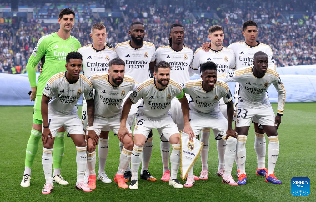 Starting players of Real Madrid line up for photographs before the UEFA Champions League final match between Real Madrid and Borussia Dortmund in London, Britain, June 1, 2024. (Xinhua/Str)
