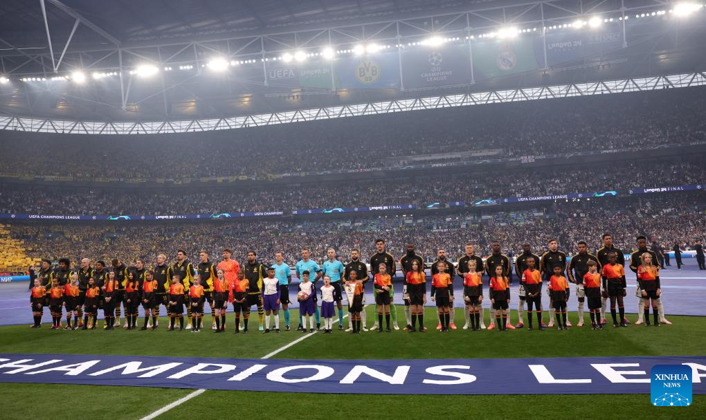 Players of both teams line up before the UEFA Champions League final match between Real Madrid and Borussia Dortmund in London, Britain, June 1, 2024. (Xinhua/Str)