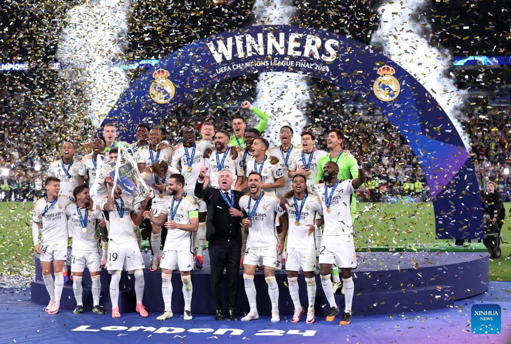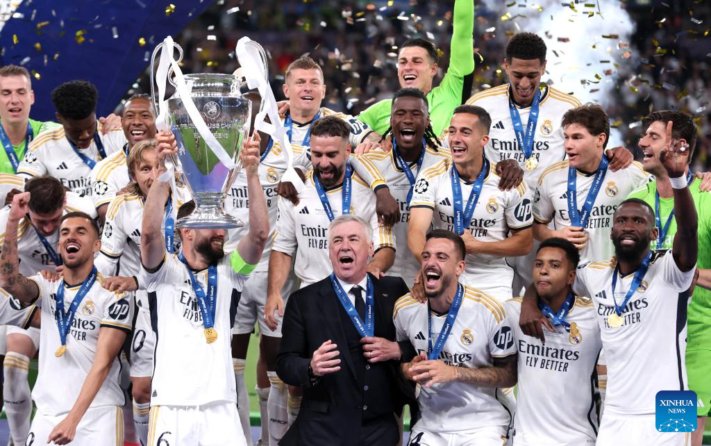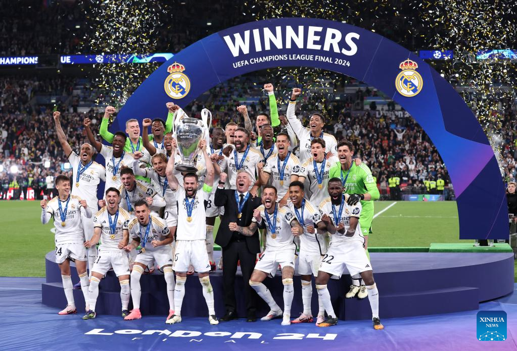 Team members of Real Madrid celebrate with the trophy after winning the UEFA Champions League final match between Real Madrid and Borussia Dortmund in London, Britain, June 1, 2024. (Xinhua/Str)