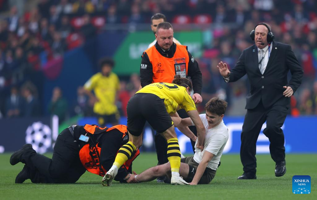 A pitch invader (front R) is tackled by staff members and Marcel Sabitzer (front C) of Borussia Dortmund the UEFA Champions League final match between Real Madrid and Borussia Dortmund in London, Britain, June 1, 2024. (Xinhua/Str)