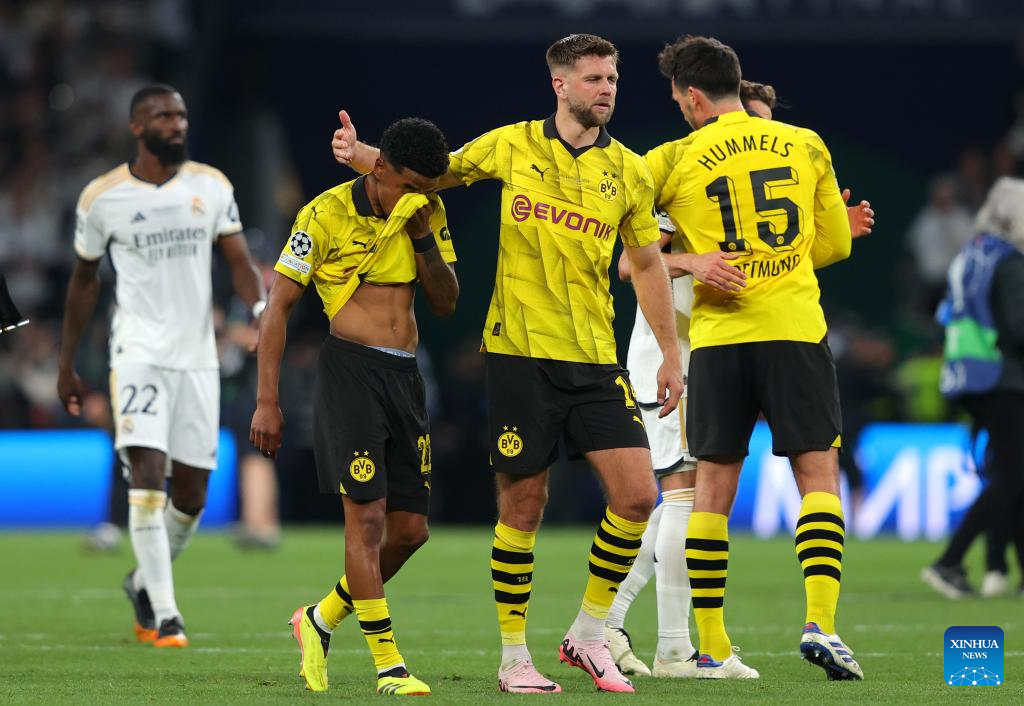 Players of Borussia Dortmund react after the UEFA Champions League final match between Real Madrid and Borussia Dortmund in London, Britain, June 1, 2024. (Xinhua/Str)