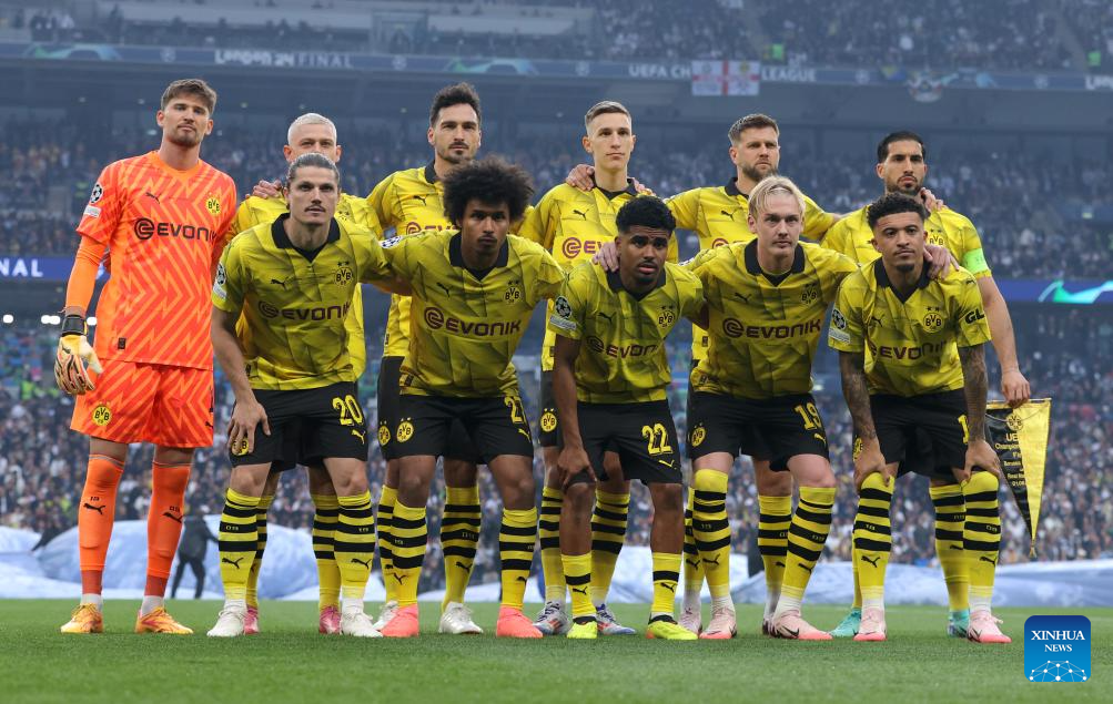 Starting players of Borussia Dortmund line up for photographs before the UEFA Champions League final match between Real Madrid and Borussia Dortmund in London, Britain, June 1, 2024. (Xinhua/Str)