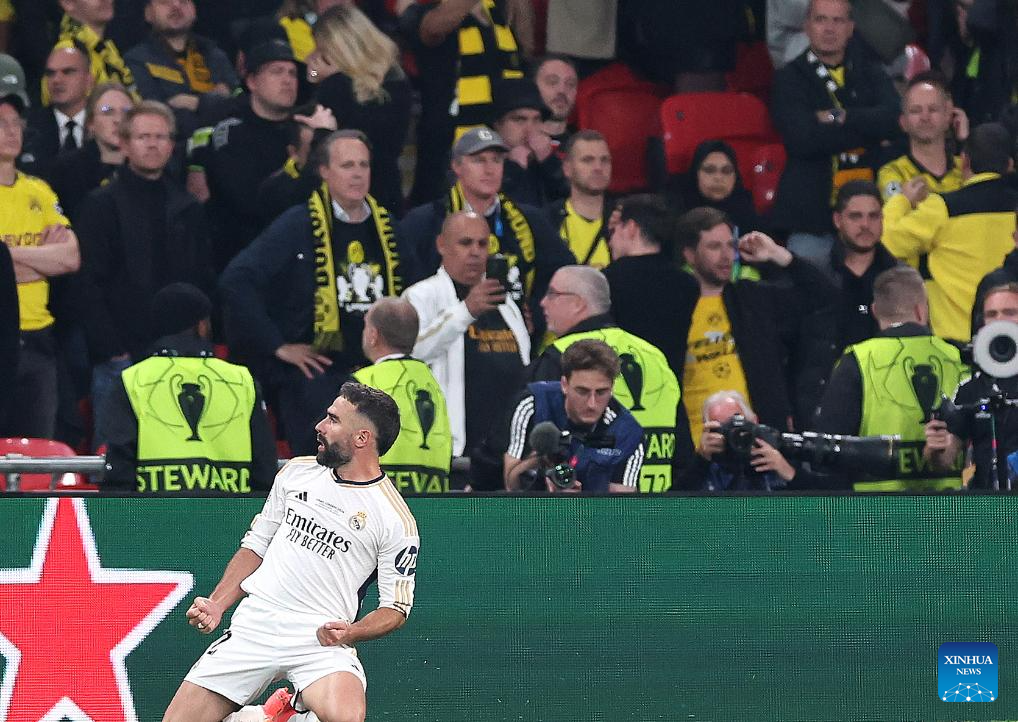 Dani Carvajal of Real Madrid celebrates scoring during the UEFA Champions League final match between Real Madrid and Borussia Dortmund in London, Britain, June 1, 2024. (Xinhua/Str)